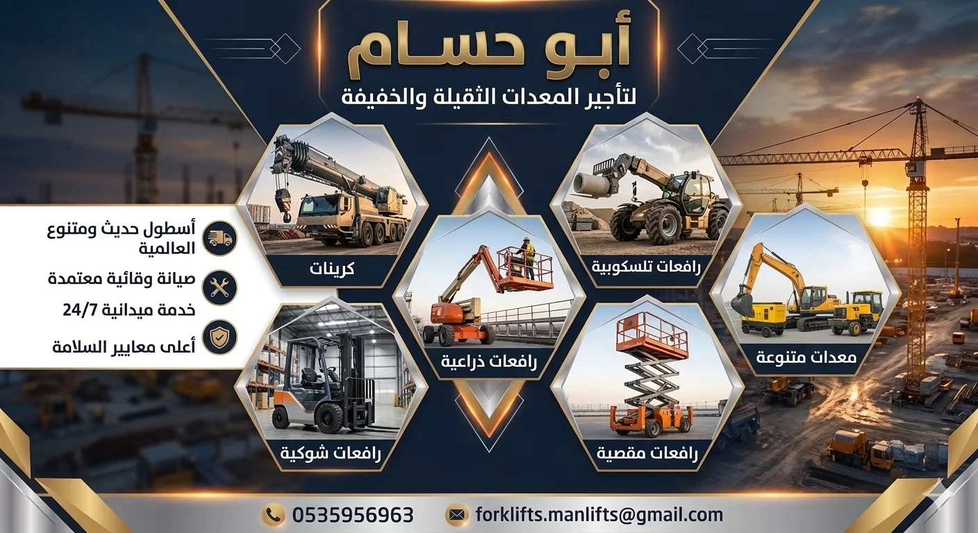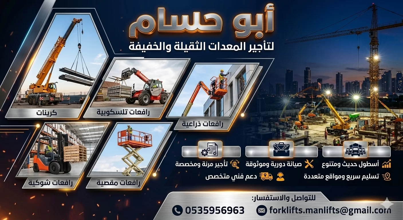 أبو حسام لتأجير المعدات الثقيلة | القوة والدقة في مكان واحد هل تبحث عن الكفاءة والموثوقية لإنجاز مشاريعك؟ نحن في "مؤسسة أبو حسام" نوفر لك أسطولاً من أحدث المعدات الثقيلة التي تضمن لك سير العمل بكل سلاسة وأمان. 🚜 أسطولنا تحت خدمتك: نضع بين يديك تشكيلة واسعة من المعدات الجاهزة للعمل فوراً: رافعات شوكية (Forklifts): لمناولة البضائع بكل سهولة. سيزر لفت (Scissor Lifts): للعمل في المرتفعات الداخلية والخارجية بثبات. بوم لفت (Boom Lifts): للوصول إلى أصعب الزوايا والارتفاعات الشاهقة. جي سي بي تليهندلر (JCB Telehandler): القوة المتعددة الاستخدامات في المواقع الإنشائية. كرين موبايل (Mobile Crane): لرفع الأحمال الثقيلة بدقة متناهية. 🌟 لماذا تختار "أبو حسام"؟ معدات حديثة: نعتمد على أحدث الموديلات لضمان أقل نسبة تعطل. صيانة دورية: فرقنا الفنية تتابع حالة المعدات باستمرار لضمان سلامة موقعك. أسعار تنافسية: نقدم أفضل قيمة مقابل جودة الخدمة. خدمة فورية: سرعة في التجاوب والتوصيل لموقع العمل. 📞 تواصل معنا الآن للإيجار والاستفسار: لا تدع مشروعك ينتظر، اتصل بنا اليوم واحصل على عرض سعر مخصص: رقم الهاتف: 053 595 6963 البريد الإلكتروني: forklifts.manlifts@gmail.com أبو حسام لتأجير المعدات.. شريكك الموثوق في النجاح!