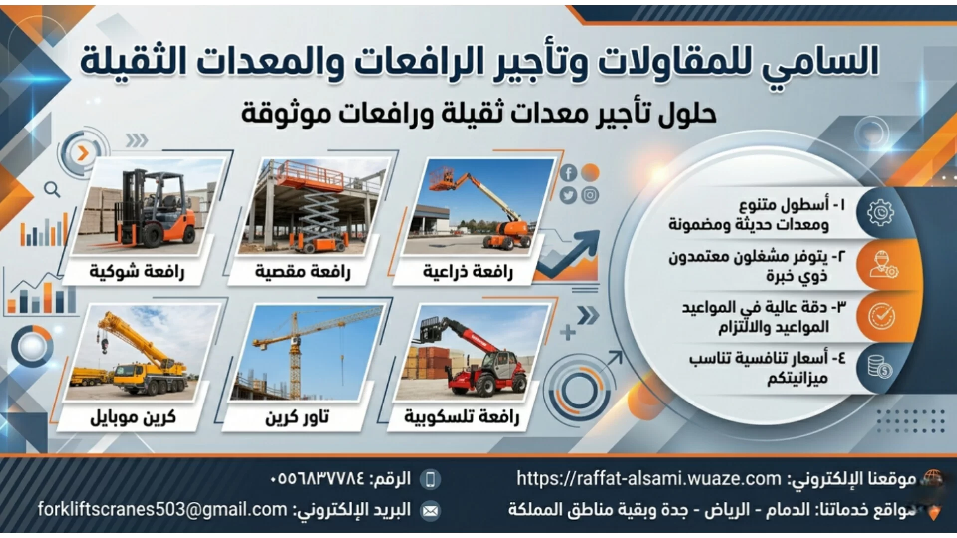 --- فوركلفت وسيزرلفت للإيجار في الدمام | حلول رفع ومناولة متكاملة إذا كنت تبحث عن فوركلفت للإيجار أو سيزرلفت (رافعات مقصية) بمواصفات حديثة وجاهزية فورية، فنحن نوفر لك حل متكامل يغطي جميع احتياجات الرفع والمناولة داخل المصانع، المستودعات، والمشاريع الإنشائية، مع توفر المعدات الحديثة وخدمة سريعة بدون تأخير. --- 🚜 الفوركلفت (Forklift Rental) نوفر رافعات شوكية بجميع الأوزان لتناسب كل الأعمال: ✔ 1 طن – 3 طن (مستودعات خفيفة) ✔ 5 طن – 7 طن (تحميل متوسط) ✔ 10 طن – 16 طن – 20 طن (أعمال ثقيلة) 🔹 ديزل للأعمال الخارجية 🔹 كهرباء للمستودعات والأماكن المغلقة 🔹 مع سائق أو بدون 🔹 استخدام: تحميل وتفريغ – نقل بضائع – أعمال لوجستية --- 🏗️ السيزرلفت (Scissor Lift Rental) رافعات مقصية بارتفاعات مختلفة للوصول الآمن: ✔ 8 متر ✔ 10 متر ✔ 12 متر ✔ 14 متر ✔ 16 متر 🔹 تشغيل كهربائي هادئ 🔹 مناسب للمولات والمصانع 🔹 أعمال صيانة – تركيب – تشطيب 🔹 ثبات عالي وسهولة استخدام --- ⚙️ أنظمة الإيجار ✔ يومي ✔ أسبوعي ✔ شهري ✔ عقود مشاريع طويلة --- 🚀 لماذا نحن؟ ✔ جاهزية فورية وتحريك سريع ✔ معدات حديثة موديلات 2020–2026 ✔ صيانة وفحص مستمر ✔ أسعار تنافسية ✔ دعم فني واستجابة سريعة نحن لا نوفر معدات فقط… نوفر حل تشغيل كامل يساعدك على إنجاز العمل بسرعة وأمان وتقليل التوقف داخل المشروع. --- 📞 للحجز والتواصل المباشر: 0530677958 0556837784 --- 🔑 كلمات مفتاحية قوية: فوركلفت للايجار الدمام, سيزرلفت الدمام, رافعات شوكية, forklift rental dammam, scissor lift rental, تأجير فوركلفت 3 طن, فوركلفت 5 طن, فوركلفت 10 طن, سيزرلفت 8 متر, سيزرلفت 16 متر, معدات رفع للايجار, تأجير معدات ثقيلة, منصة مقصية, forklift saudi arabia, scissor lift ksa --- إذا تريد نسخة أقصر للريلز أو إعلان مبوب أو نسخة ثانية مختلفة 100% لتجنب التكرار ونشرها في منصة أخرى — أجهزها لك فورًا 🔥