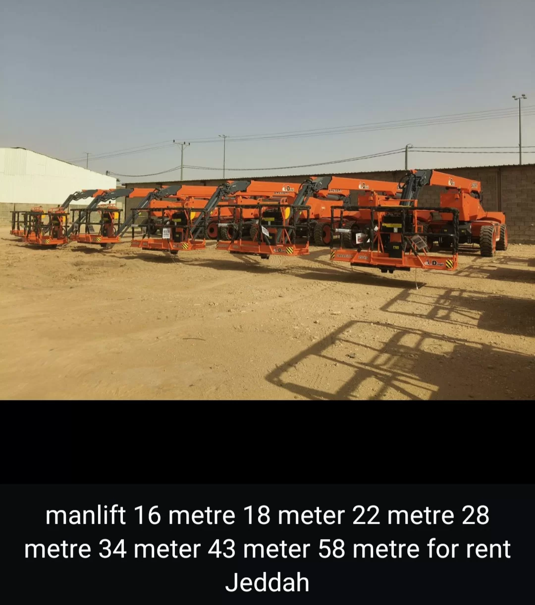 1 _ سيزرلفت ( Scissor Lift) متوفر لدينا للايجار بالارتفاعات التالية : _ 6 متر ( كهرباء) _ 8 متر ( كهرباء) _ 10متر ( كهرباء) _ 12 متر ( كهرباء) _ 14 متر ( كهرباء) _ 16 متر ( كهرباء ) _ 18 متر ( ديزل) ** كل أنواع السيزر لفت المذكور أعلاه من الارتفاعات موديل حديث وأوراقها كاملة شهادة تأمين وتيوفي TUV CERTIFICATION. 2_ مان لفت ( manlift) متوفر لدينا للايجار بالارتفاعات التاليه : _ 12 متر _ 14 متر _ 16 متر _ 20 متر _ 22 متر _ 24 متر _ 28 متر _ 30m,34, 36m, 40m,44m,46m,54m ** كل ماذكر أعلاه من الارتفاعات للمان لفت موديلها حديث جدا وأوراقها كاملة شهادة تأمين وتيوفي TUV CERTIFICATION 3 _ كرينات ( crane) متوفرة للايجار : 7 طن _ 10 طن _ 15 طن 25 طن _50 طن _ 100 طن 250 طن _ 500طن _ 750طن 200 طن _ 1200 طن ** كل ماذكر أعلاه من الكرينات أوراقها كاملة شهادة تأمين وتيوفي TUV certification 4_ رافعات شوكية( forklift) متوفرة للايجار : 2.5 طن 3 طن _ 5طن _ 7طن 10طن _ 15 طن _ 25 طن *كل ماذكر أعلاه من الفوركلفت أوراقها كاملة ولديها تيوفي TUV CERTIFICATION 5_ بوم لفت (Boom lift) متوفر لديناالتيلسكوبي ( Boom Lift telescopic) وأرتيكليتد ( Boom Lift articulated) بكل الارتفاعات والمقاسات أوراقها كاملة شهادة تأمين وتيوفي TUV CERTIFICATION 6 _ تاور لايت متوفرة للايجار ( Tower lights) 7_ جي سي بي عرجاء متوفرة للايجار ( jcb) أوراقها كاملة ولديها تيوفي TUV CERTIFICATION *** خبرتنا الواسعة في مجال المعدات الثقيلة والروافع وامتلاكنا لشركة مختصة في مجال المعدات والمقاولات تمكنا من بناء الثقة مع زبائيننا في سوق العمل، وتوفرت المصداقيه والنجاح كون لدينا اسعار مناسبة وتنافسية مع مالكي ومؤجري المعدات الأخرين.. (الثقة، السرعه، الأمن والسلامة، السعر المناسب) هم من أهم الأشياء التي تفردنا بها. اتصل لنا نصل لك. للتواصل بنا على الهاتف والواتس اب: 0569273902