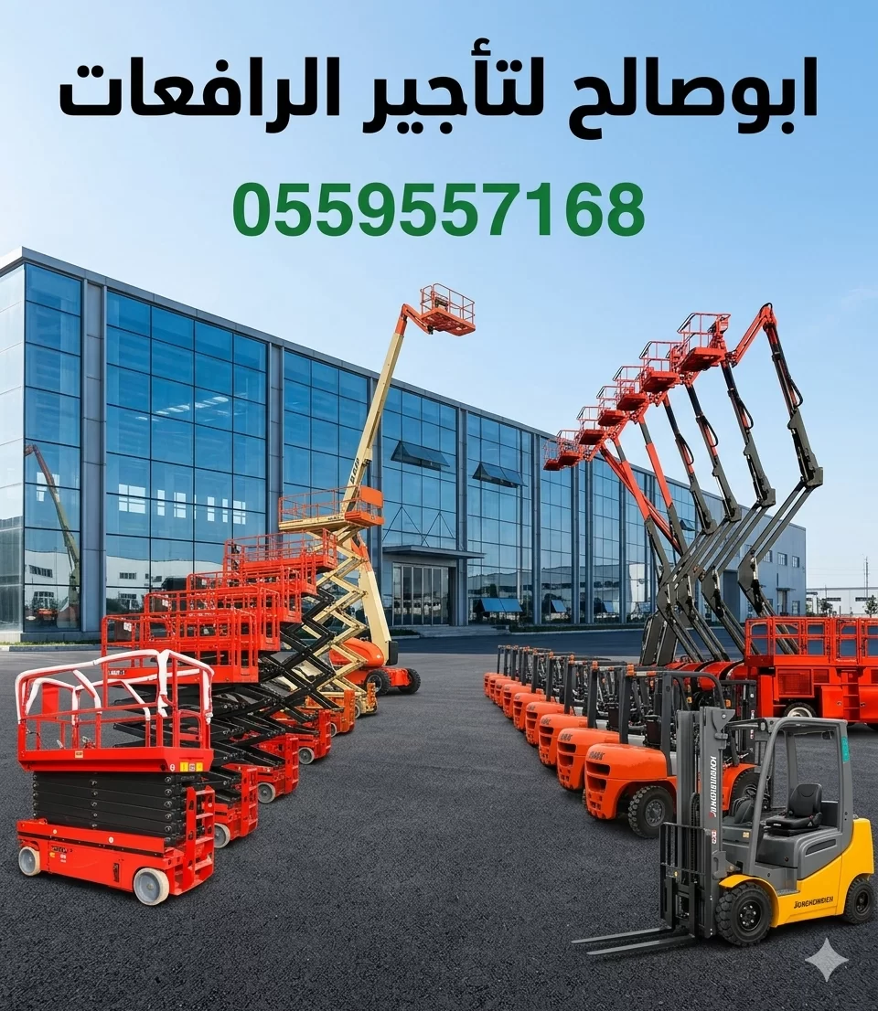 معلومات التواصل رقم الجوال: 0559557168 نطاق الخدمة: الرياض، جدة، والدمام. أنواع الرافعات والمعدات المتاحة تتوفر مجموعة متنوعة من المعدات الثقيلة المناسبة لمختلف التضاريس والاحتياجات الإنشائية: سيزر لفت (Scissor Lift): رافعات مقصية للعمل في الأماكن المرتفعة. مان لفت (Man Lift): رافعات ذراعية مفصلية وتلسكوبية. فوركلفت (Forklift): رافعات شوكية لتحميل ونقل البضائع. كرينات (Cranes): أوناش متحركة لرفع الأوزان الثقيلة. جيسيبي (JCB): معدات حفر وتحميل متعددة الاستخدامات. [!NOTE] الصور توضح توفر موديلات حديثة مثل Zoomlion الكهربائية والصديقة للبيئة، بالإضافة إلى معدات من شركات عالمية مثل JLG و Liebherr. هل ترغب في أن أقوم بالاتصال بهذا الرقم نيابةً عنك أو تحديد موقع أقرب فرع لك في إحدى هذه المدن؟